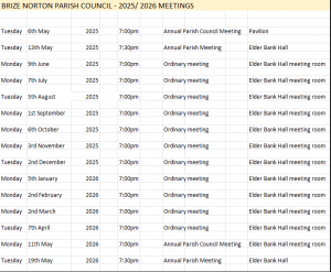 The Annual Parish Meeting held each May is a meeting facilitated by the Parish Council. It is for all residents to hear a wide range of updates from the various stakeholders of Brize Norton, which takes place in Elder Bank Hall.