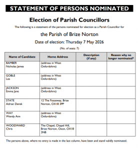 For further details please contact the clerk, clerk@brizenortonparishcouncil.co.uk